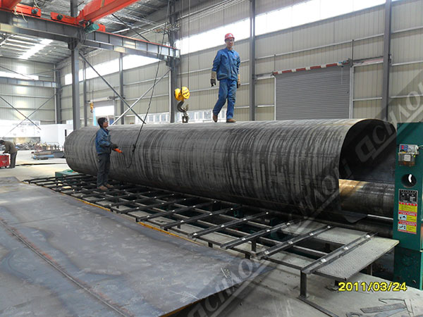 掛車(chē)用卷板機(jī)增加托輥及上輥撓曲補(bǔ)償可使筒件取得較好的直線度??稍黾油馔辛霞芗皟?nèi)升料架使操作更便利,更少人工??膳浜锨昂蟮拦ば蜃魃a(chǎn)線優(yōu)化使用。