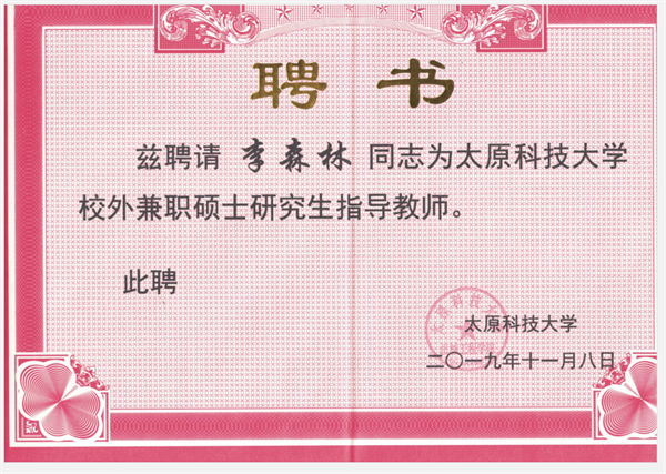 熱烈祝賀我司工程師李森林受聘為燕山大學、太原科技大學碩士生校外指導教師。